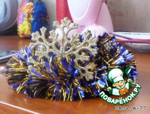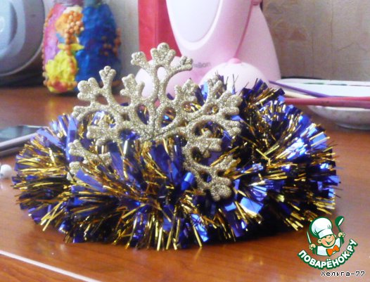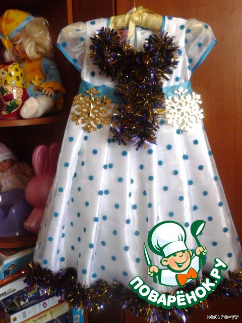 Корона сделана из ободка, снежинки (из набора, купленного в магазине; такие же на платье)и мишуры.