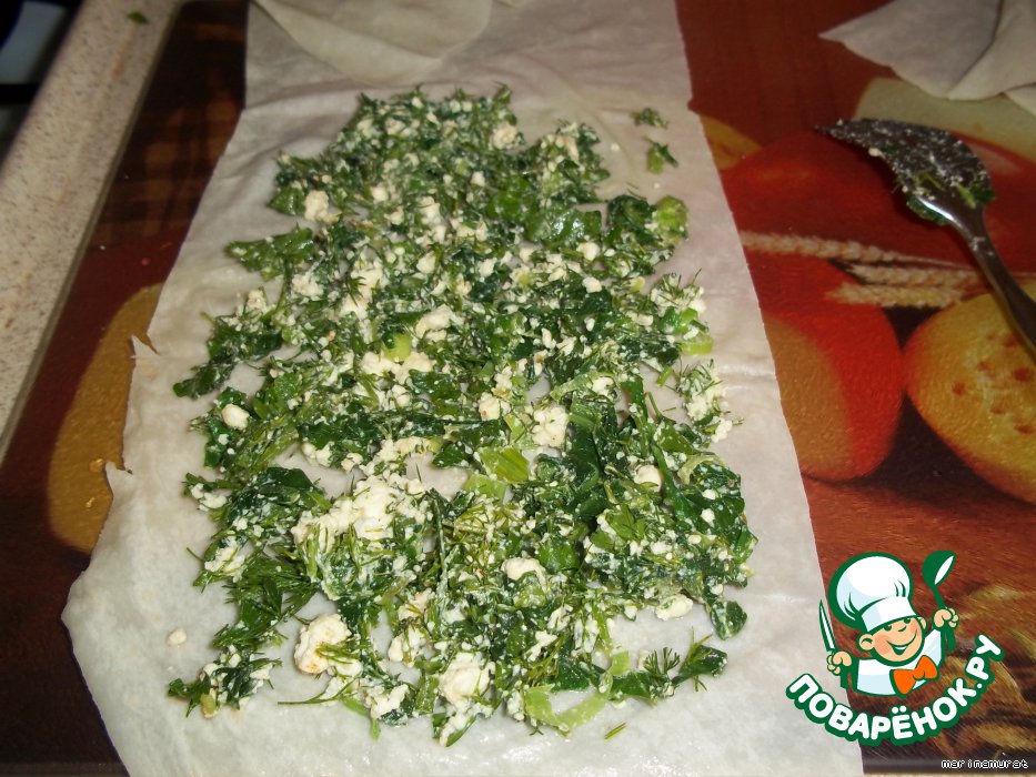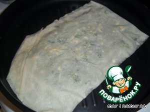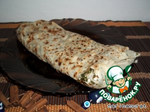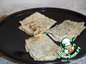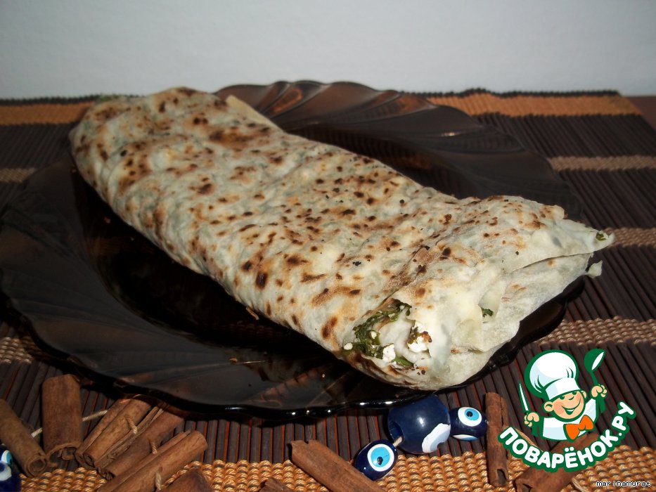 Начинка: Шпинат, лук порей, немного соленого творога, который крошится хорошо, перец, паприка по вкусу. Все ингредиенты по колличеству берем на свой вкус; шпинат и лук порей предварительно обжариваем минуты 3 на сковороде и смешиваем с творогом и специями. Тесто очень тонкое, с ним надо нежно обходиться. Можно сделать одну большую лепешку, а можно сделать 4 небольшие, или одну огромную как на последнем фото. Смазать тесто слегка водой и кладем начинку по всей поверхности теста, второй половиной закрываем и хорошенько смазываем края водичкой. Жарят их без масла на раскаленной сковороде по 1 минуте с каждой стороны!!! Лучше всего использовать сковороду-грилль, если нет таковой, то на обычную сковороду капнуть немного масла и размазать...... Лепашка сохнет и появляются на ней пятнышки, снимаем и кладем на блюдо! Готово!!!! Можно скрутить рулетиком и наслаждаться....