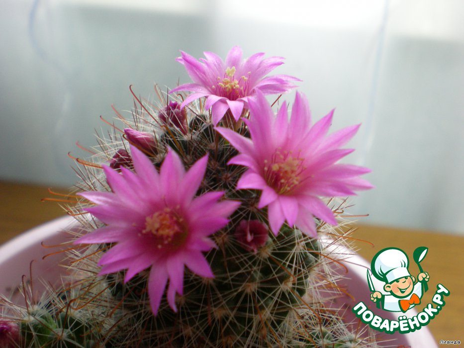 Вот такой кактус расцвел на моем окне. Вообще я не любитель кактусов. А этого красавца дочь принесла еще совсем крохой. И вот через несколько лет он порадовал нас своими маленькими розовыми цветочками.