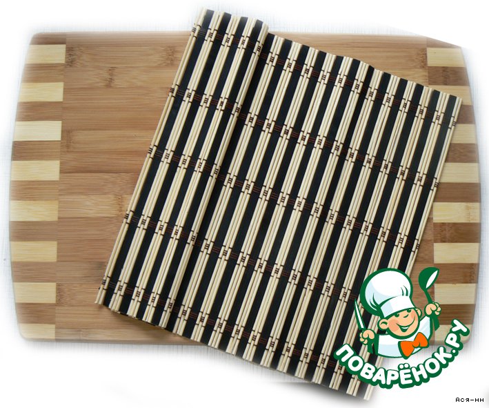 Большая разделочная доска из бамбука 45Х30 см. и пестрый бамбуковый коврик.