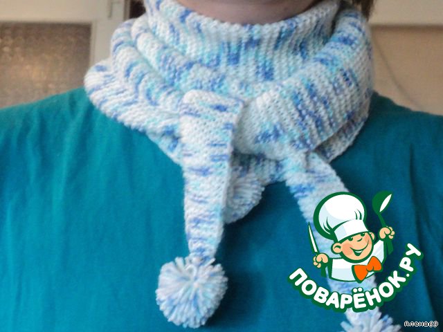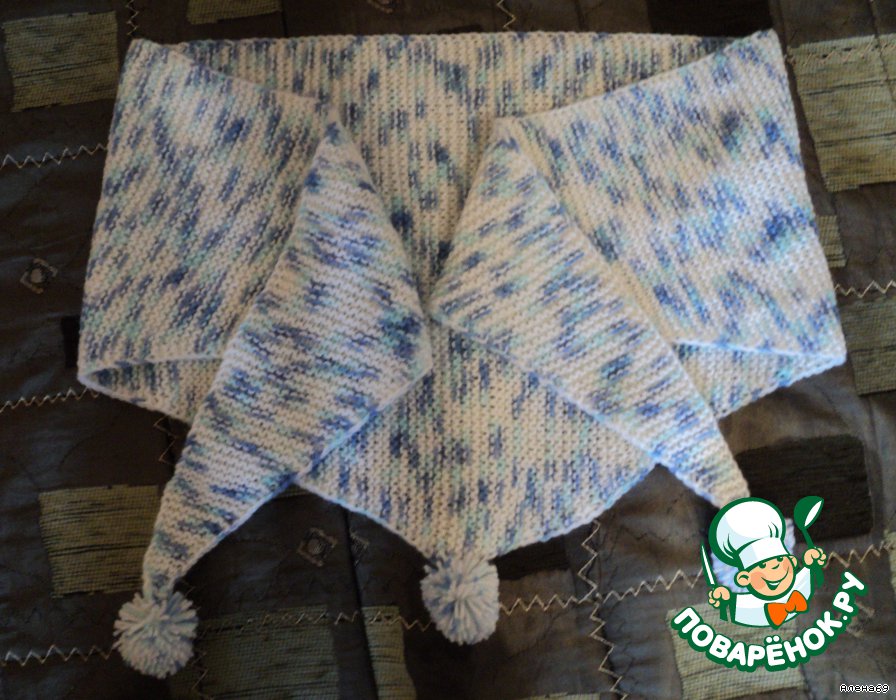 Пряжа 100 % акрил, 400 м/100 гр, вязка простая - платочная. Весь моточек ушел, остатки - в помпошках. Он у меня лет пять лежал, не знала, куда приспособить. Спицы № 2,5.