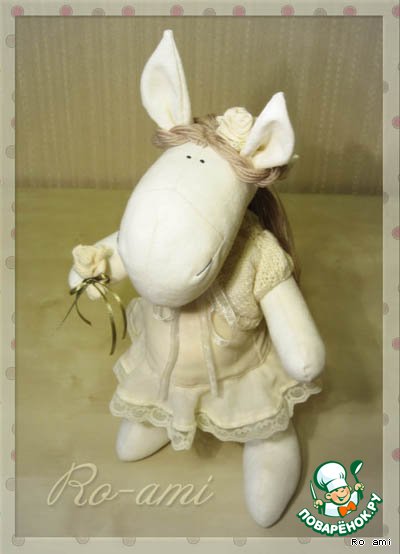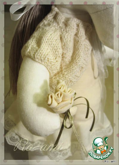 Стоит, сидит, ручки подвижные. Одета в платьице с воланами из батиста и вязаное болеро из хлопка с лентой-застежкой в воротнике. В руках - нежный букетик цветов, в голове - украшение-цветок. Грива заплетена в колосок.