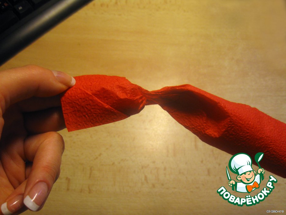 Снова крепко сожмите салфетку чуть ниже места, где вы перестали ее скручивать. Продолжайте скручивать от этой точки до конца салфетки.