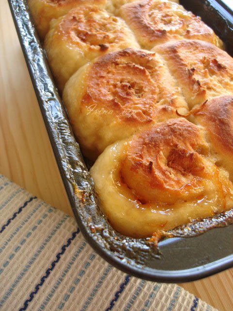 Сверху выложила рулеты из теста.