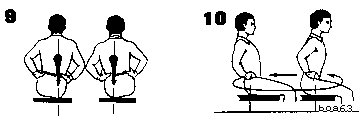 8. Сидя, грудь вперед, напрячь спину, выпрямить руки и слегка отвести назад. Ладони параллельно полу. Напряжение удерживать 6—10 с. Расслабиться, опустить расслабленные кисти — 10 — 15 с. Повторить 2—3 раза.
