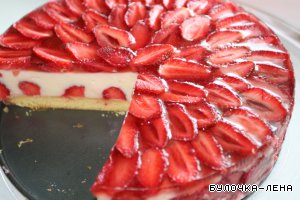 Делаем бортик из более крупной клубники. Разрезаем клубнику пополам и выкладываем плотно "попкой" вниз, а срезом к бортику формы. Получается "заборчик". Сам корж бисквита выкладываем тоже половинками клубники срезом вниз. Заливаем йогуртовой заливкой. Ставим в холодильник на часик. Достаем и украшаем торт пластинками из клубники и заливаем сверху желе (лучше красного цвета - ярче выглядит). Ставим в холодильник еще на часика 3-4.