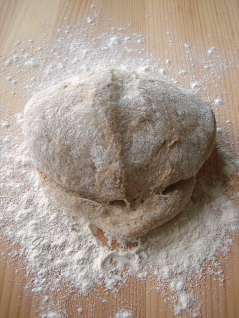 Месила тесто не долго, пару минут. Тесто липковато, что характерно для ржаного. А потому я поколотила его об стол, удары считала, 100 раз.