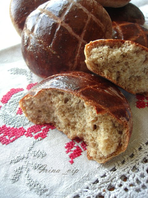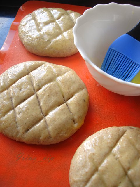 У меня противень маловат, поэтому получились не лепешки, а булочки. Но состав теста и оригинальный декор из рецепта.