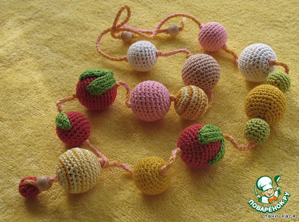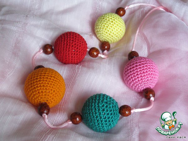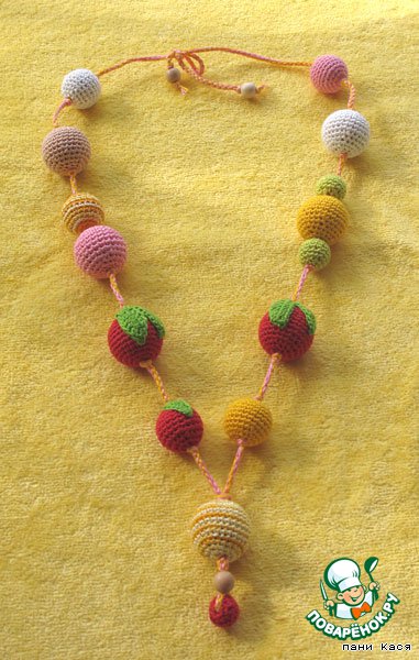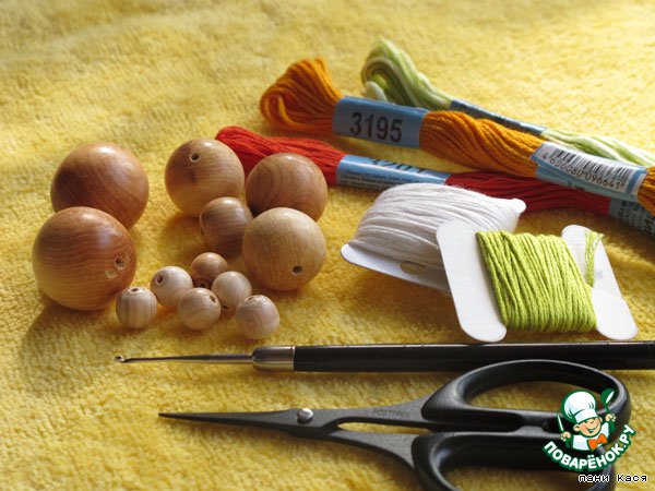 Нужно только несколько можжевеловых бусин, мулине и крючок. Ну, и ножнички с терпением