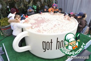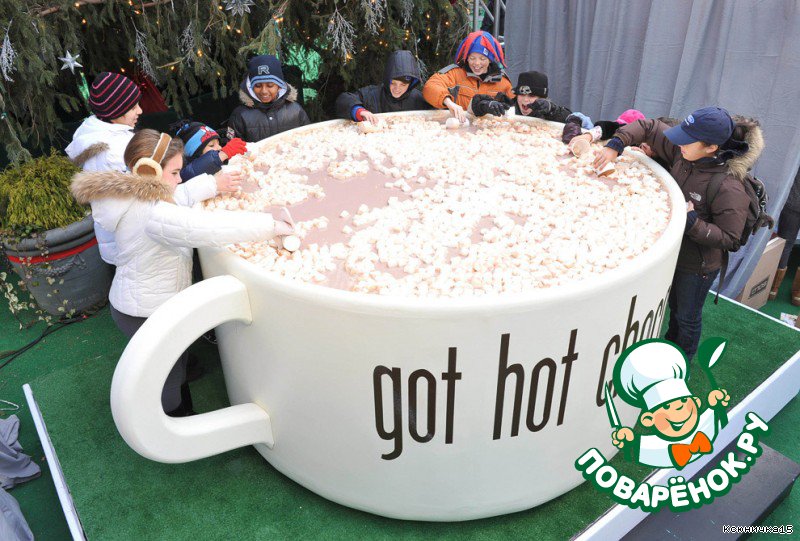 Дети черпают горячий шоколад из огромной чашки, которую сделала Американская молочная ассоциация в попытке установления рекорда. Самая большая чашка горячего шоколада вмещает 500 литров. Нью-Йорк, 30 декабря 2009 г. (AP Photo/American Dairy Association, Diane Bondareff)