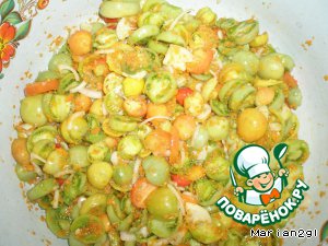 1.нарезала зеленые помидорки в таз (в котором обычно тушу овощи в заготовку)