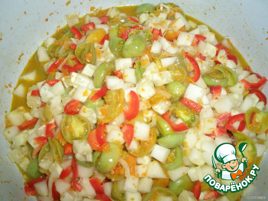 1.нарезала зеленые помидорки в таз (в котором обычно тушу овощи в заготовку)