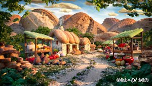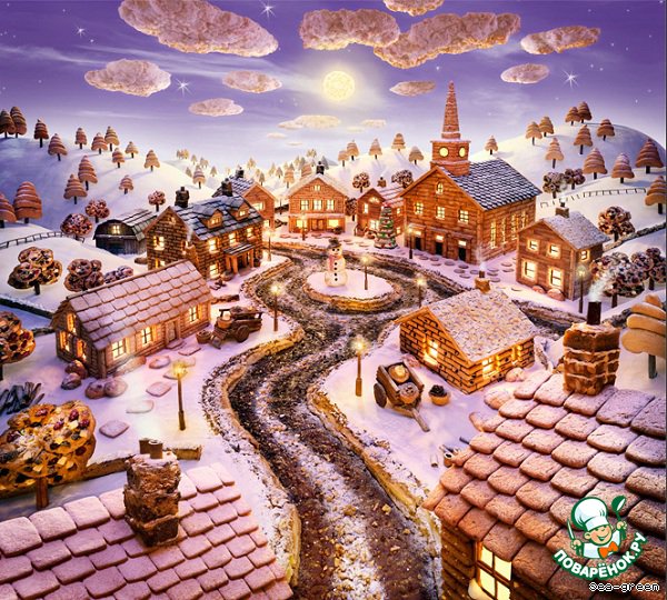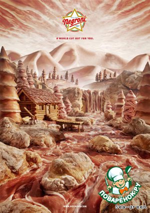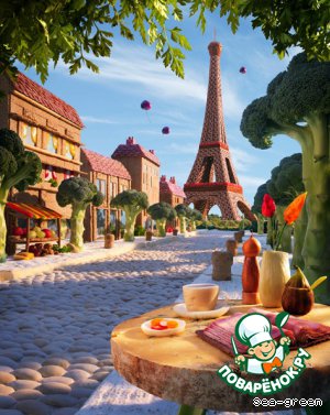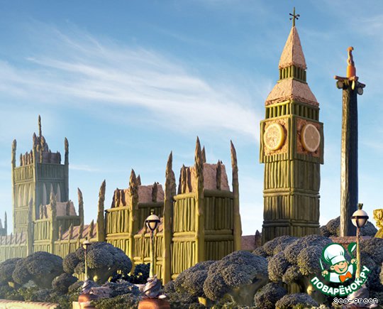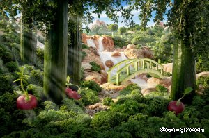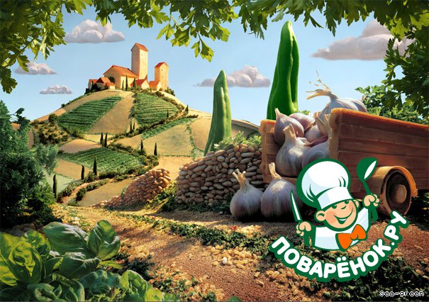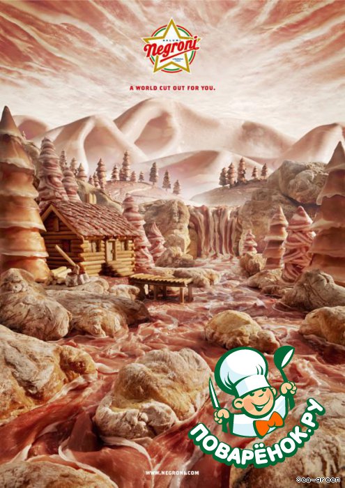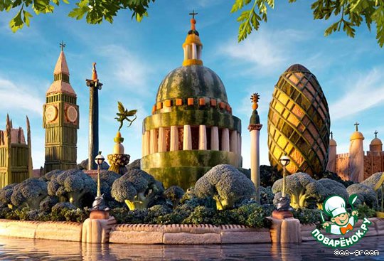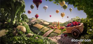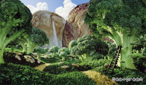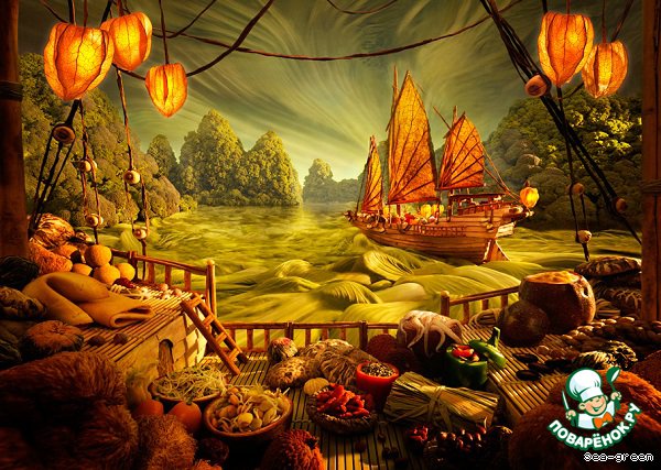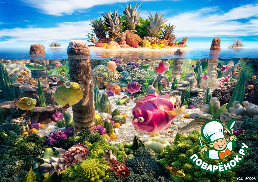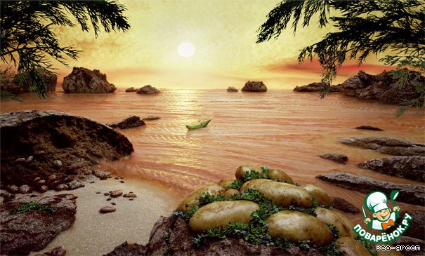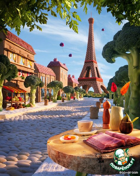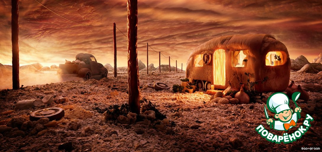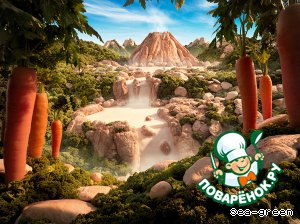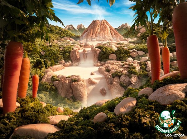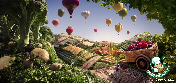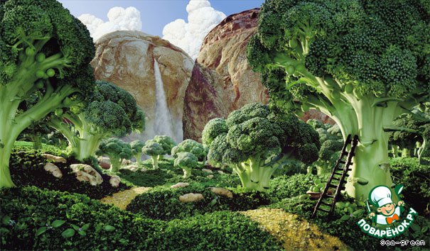 Все дело в том, что Карл Уорнер, иллюстратор по образованию, мастер жанра с его подачи известного как «Foodscapes», то есть пейзажи из еды. На его картинах горы сделаны из хлеба, деревья – это брокколи, волны — листы капусты, а роль камней исполняет печеный картофель.