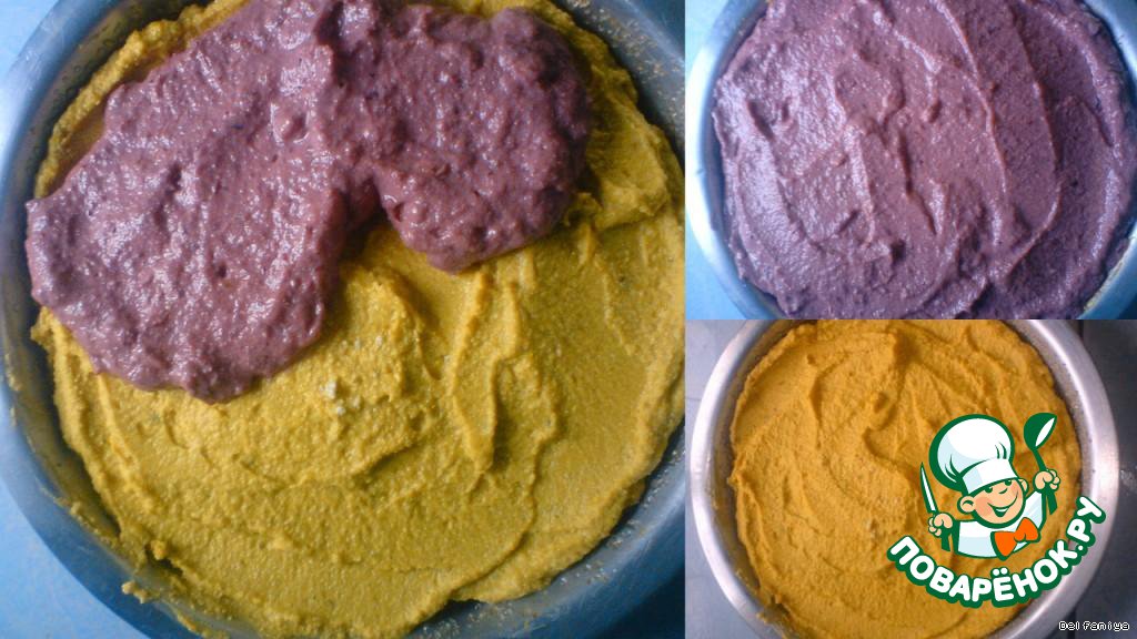 7. Выложить на крошку обе массы в произвольном порядке. Поставить в нагретую до 180 гр. духовку, выпекать в течение часа. Остудить при комнатной температуре и поставить в холодильник. Чтобы пирог хорошо держал форму – желательно оставить его в холодильнике на ночь или на восемь часов.