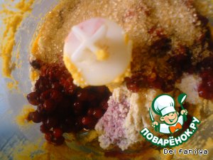 6. В другую вмешать с помощью блендера клюкву и две ложки сахара.