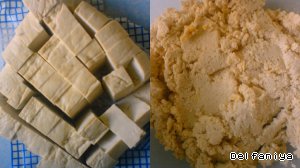 4. Тофу порезать кубиками и измельчить в блендере. Разделить массу на две части.