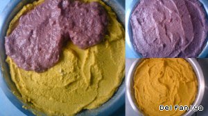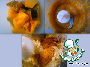5. В одну вмешать тыквенное пюре с молотым имбирем (можно не добавлять, особенно, если он уже есть в печенье), корицу и куркуму для цвета (можно шафран), одну ложку сахара.