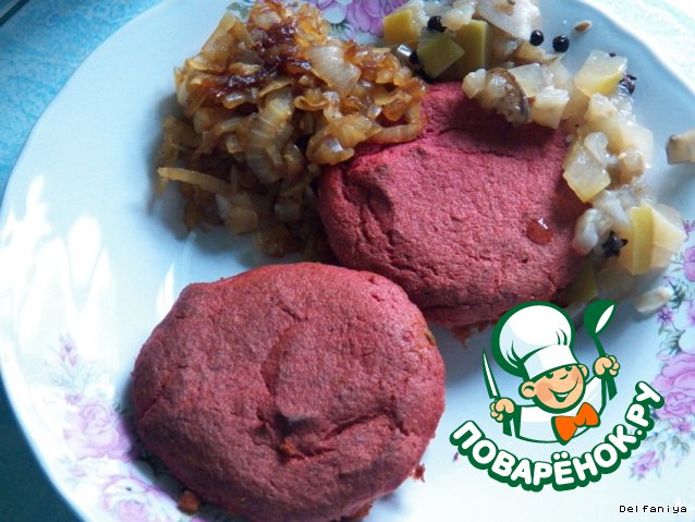 Терла на мелкой терке все компоненты, мясо в комбайне измельчала. Так как жареное на масле, не едим, запекала в формочках в духовке. Очень нежные котлеты! Подавала по совету автора с жареным луком и маринованными овощами, огурцов не было – кабачки и баклажаны. Когда запечатлела блюдо и начала есть, подумала и перемешала овощи с домашним йогуртом, получилось что-то вроде дипа или чатни, не знаю, как правильно это назвать, но так вышло вкуснее Лук, как обычно, жарила в собственном соку, без масла.