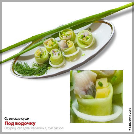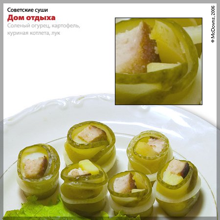 Начнем же делать суши. Первым номером возьмем какой-нибудь простой рецепт с минимумом компонентов. Ломник вареного картофеля объединим с ломтиком жареной куриной котлеты, обернем в тонкий продольный лепесток соленого огурца и закрепим колечком репчатого лука. Мы назвали этот рецепт «Дом отдыха». Отведайте его, обмакнув в основной соус, и прикройте глаза... разве не начинает казаться, что вы сидите в столовой простого советского дома отдыха в средней полосе России?