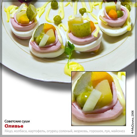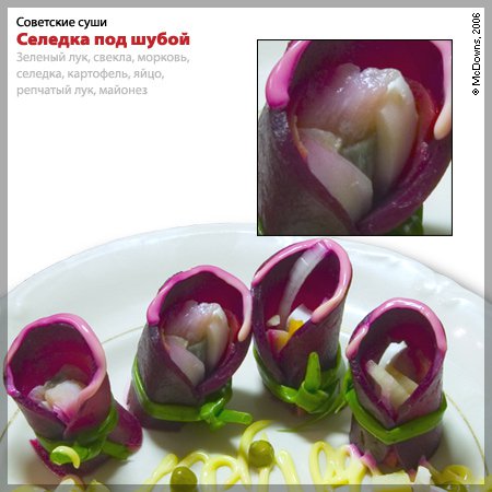 Далее, конечно же, два рецепта, без которых (в несколько иной форме) не обходится ни одно советское застолье. Конечно же, это «Оливье» и «Селедка под шубой». Думается, что всем прекрасно известны рецепты этих блюд и потому каждый с легкостью приготовит эти суши по своему вкусу (например, мы не добавляли в селедку свежее яблоко, а многи считают это немыслимым). Обратите внимание, в этих двух рецептах используется майонез, хотя мы не слишком одобряем этот французский соус.