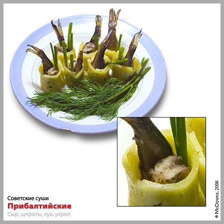 Однако не только русская кухня может послужить источником вдохновения. Вот, например, суши «Прибалтийские»: шпроты, сык, зеленый лук. Закреплять их ничем не нужно, так как смазанный шпротным маслом сыр прекрасно держится сам. Украсили мы их свежим укропом.
