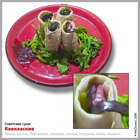 Богатейшей кавказской кухне посвящены суши «Кавказские», самые сложные в приготовлении. Обжарьте кольца баклажана в растительном масле с солью и пряностями по вкусу. В аккуратно вырезанную полоску армянского лаваша заверните жаренный баклажан, аккуратно уложите сверху зерна вареной красной фасоли и нарезанный зубчик маринованного чеснока. Прибавьте кусочек соленой черемши, пару листиков кинзы и заверните, после чего обвяжите подходящей по длине веточкой свежей петрушки. Уверяем вас, вся эта возня вполне оправданна! Вкус — фантастический. Подавайте с кинзой и соусом ткемали.