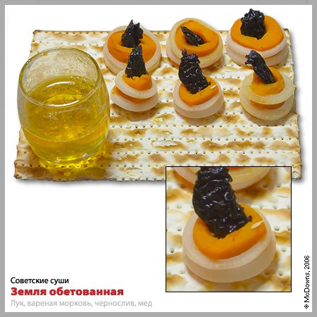Мы не могли обойти своим вниманием и еще одну национальную кухню — еврейскую и создали суши «Земля обетованная». Вареная морковь режется на порционные куски, затем вырезается ее сердцевина. В полученное отверстие помещается кусочек чернослива, а сверху на морковь надеваются два колечка репчатого лука. Суши подаются на маце и непременно со свежим медом. Эти суши не нужно макать в первые два соуса, а следует обмакивать в мед и заедать мацой. Очень вкусно!