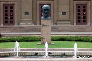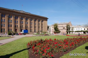 На площади перед учебным корпусом расположены :небольшой фонтан,бюст поэта Райниса и солнечные часы.