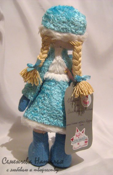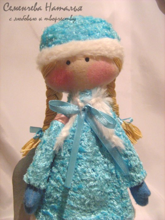 Это снегурочка. Выкройку я разрабатывала сама, хотя подобные куклы вы, наверное, уже видели. Ростиком она 27 см. А одета снегурочка в традиционную голубую шубку и шапочку, утеплена сверху меховой жилеткой, обута в фетровые валеночки с пумпонами, а на ручки одела варежки в комплект к валенкам.