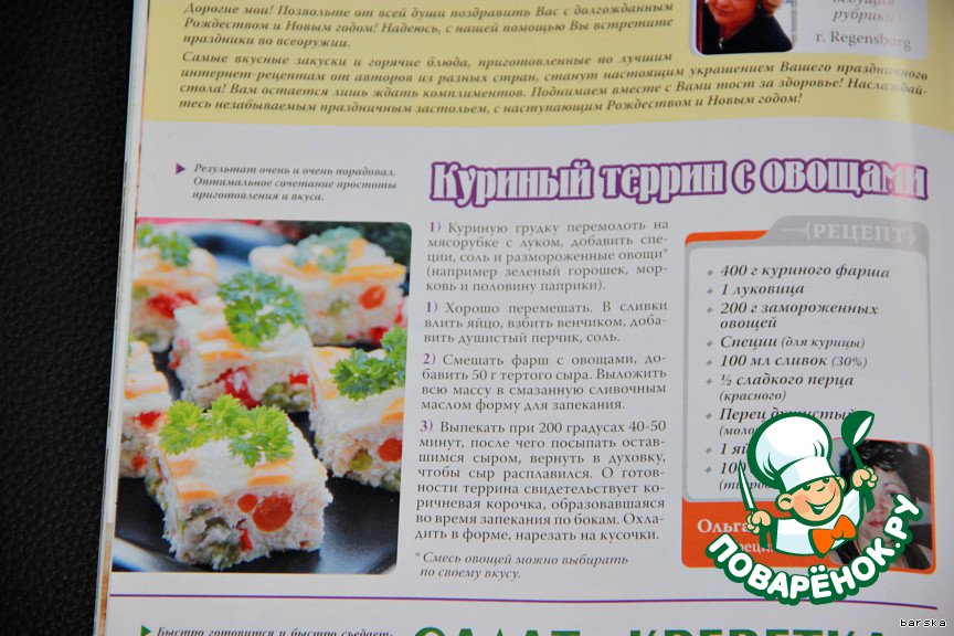 1. По итогам КН "Балканской кухни" в НГ номере приветствуем Олю Бабич (Греция) с лёгким и вкусным "Террином из курицы с овощами":