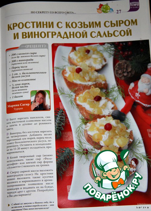 7.Самый большой разворот и море Ваших апплодисментов получили "Кростини с козьим сыром и виноградной сальсой" от Марины marinamurat (Турция), которые прекрасно дополнят бокал шампанского на НГ!(КН "Готовимся к НГ, часть1). ПОДНИМАЕМ БОКАЛЫ!