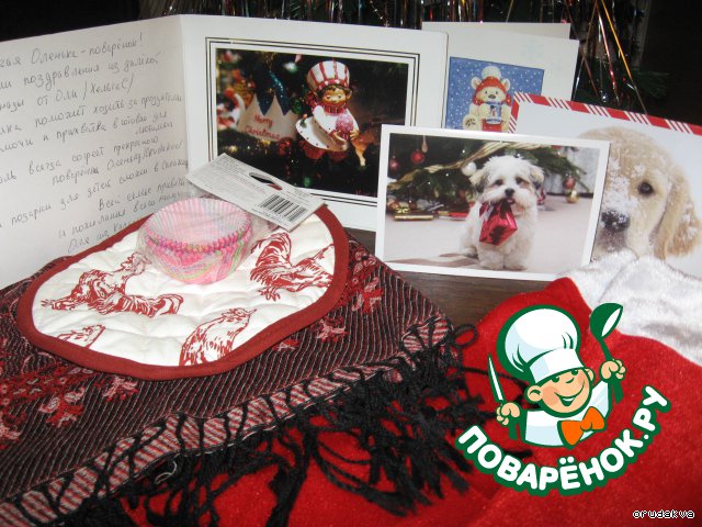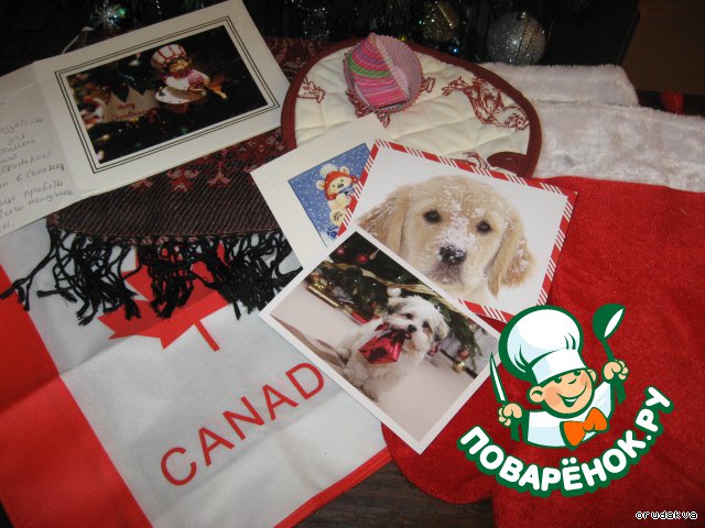 И вот они мои подарки: два сапожка для подарков, сумка с символом Канады - кленовым листом, формочки и прихватка, очень нежная, легкая, но теплая шаль, открытка с приветами и конвертик с открытками для папы и малышей!