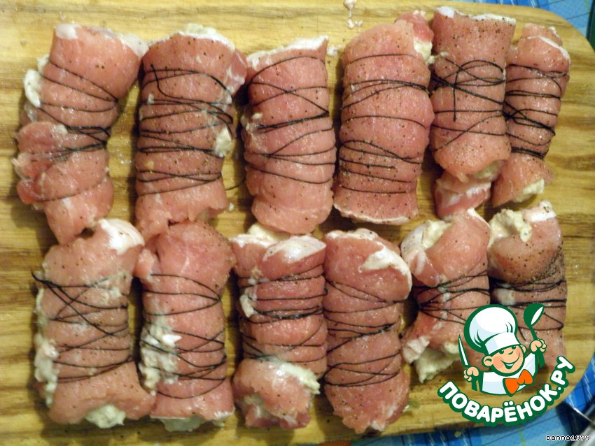 Сворачиваем мясо рулетом. Закрепить можно деревянными зубочистками, но я в этом блюде предпочитаю пользоваться старым проверенным бабушкиным способом - обмотать нитками.