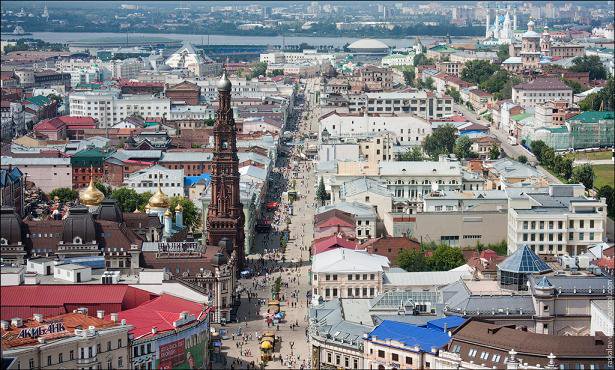 Панорама на центр города: пешеходная ул.Баумана, на заднем плане культурно-развлекательный центр «Пирамида», Цирк, Кремль