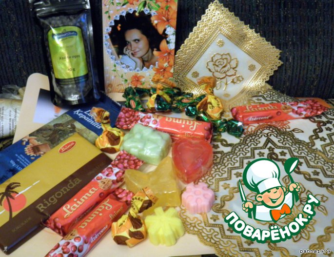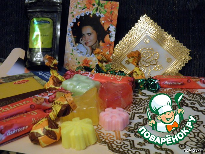 ) и шоколада, натурального ароматного фигурного мыла, набора красивых салфеток (будет теперь что использовать в рецептах для антуража) и еще пакетика ягод можжевельника. У нас его невозможно найти и в одном из комментариев к рецептам я упомянула об этом - и вот теперь я счастливая их обладательница. Элечка, еще раз спасибо тебе огромное!