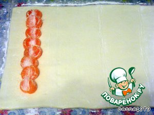 В этот раз я воспользовалась благами цивилизации и использовала покупное слоенное тесто, которое разморозила и немного раскатала. Мандарины (2-3 шт) очистила от кожуры, разделила на дольки и выложила вдоль одного края, как показано на фото, а сверху посыпала немного сахара.
