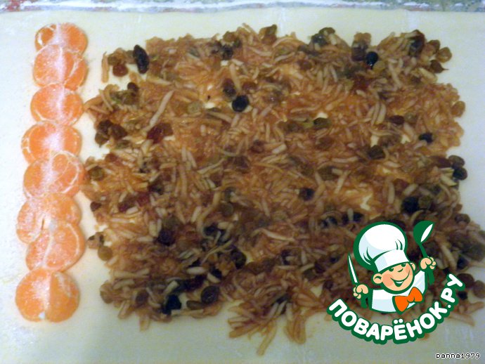 В этот раз я воспользовалась благами цивилизации и использовала покупное слоенное тесто, которое разморозила и немного раскатала. Мандарины (2-3 шт) очистила от кожуры, разделила на дольки и выложила вдоль одного края, как показано на фото, а сверху посыпала немного сахара.
