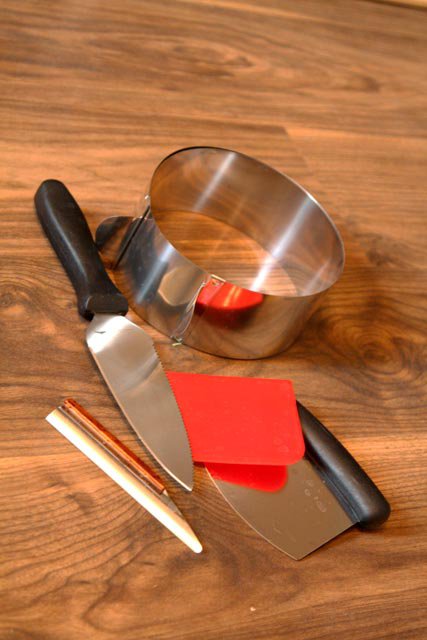 Мне достались: раздвижная форма для сбора тортов, нож-лопатка для тортов, кулинарный шпатель, гибкий шпатель для теста и скребок для уборки стола