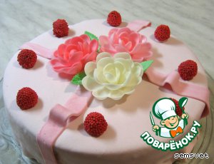 Мастика из маршмеллоу с сахарной пудрой, цветы вафельные (подарила подруга из Питера, у нас такое чудо не продаётся). Сам торт бисквитный, в качестве крема - толстые слои творожно-йогуртовоего суфле, с добавлением протёртой смородины для цвета и мака для интереса.