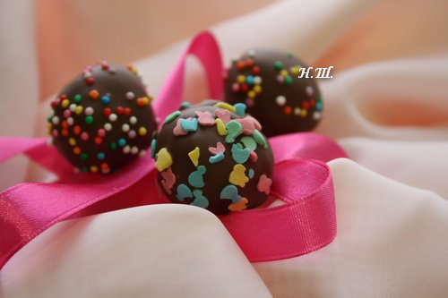 Потом, достав шарики из холодильника, вставила зубочистки и окунула в растопленный шоколад, обсыпала посыпкой и отправила опять в холодильник для окончательного застывания.