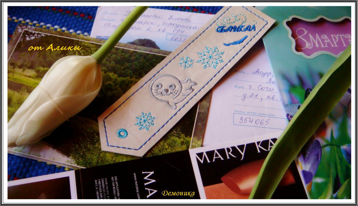 Послание от Алики. Красивейшая открытка с видом Байкала, набор макияжа на открытке и кожаная закладочка с вышитым нерпёнком. Так трогательно!