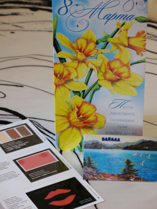 Леночки Алика. Она подарила мне чудесный магнитик с видом Байкала. Вместе с магнитиком Лена прислала весеннюю поздравительную открыточку с теплыми словами и открыточку с макияжем MARY KAY (даже не знала, что такое бывает ). Леночка, спасибо тебе огромное, ты подарила мне массу удовольствий! Как же это приятно!