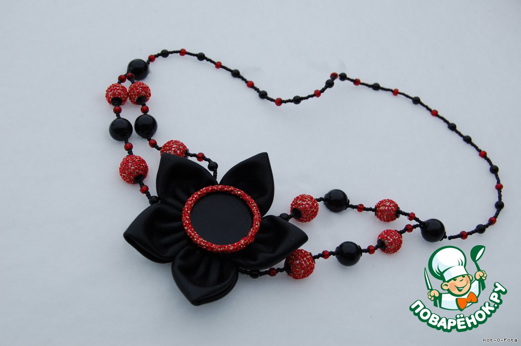 Цветок получился эффектный, но с кож. заменителем работать не очень легко, он хоть и тонкий, но при сборке приходится уже прилагать усилия. Серединку закрыла обтянутой "кожей" пуговицей. По замыслу, у бус смещённый центр, т.е. цветок носится на правой или левой стороне (по желанию).