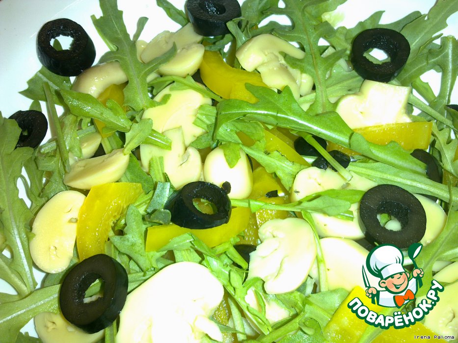 Грибы, перец, маслины - порезать как душе угодно, смешать с рукколой ( еще отлично бы добавить помидорки черри, но у меня не было(((, оливк.масло смешать с соевым соусом и заправить перед подачей! Салат очень вкусный!Попробуйте!
