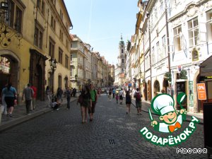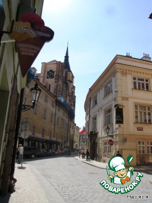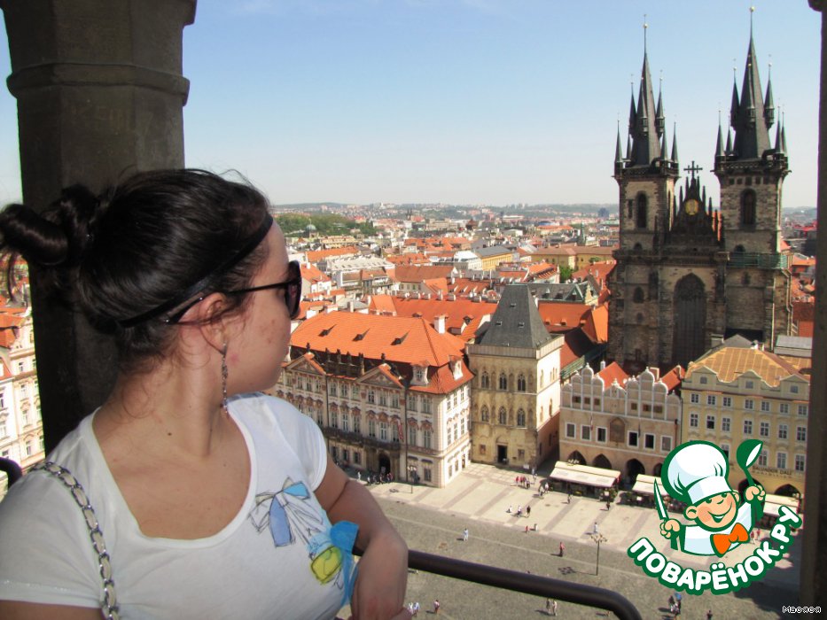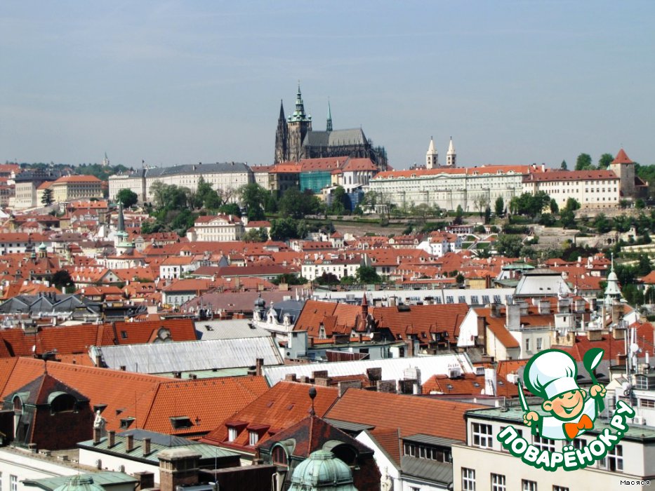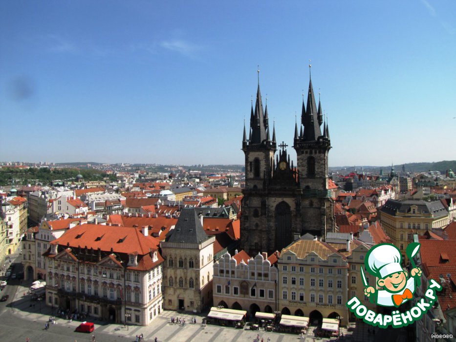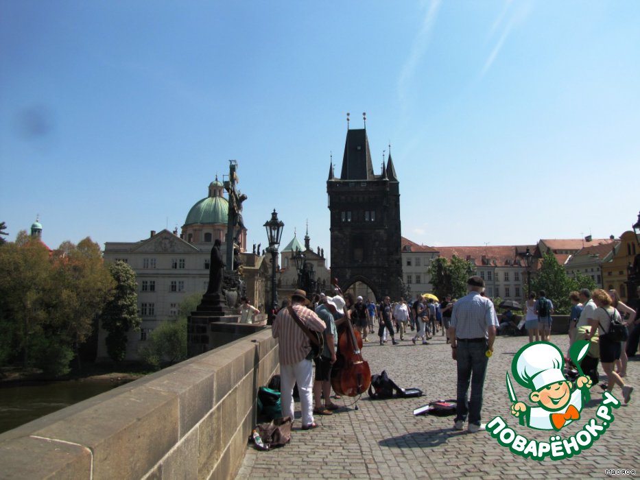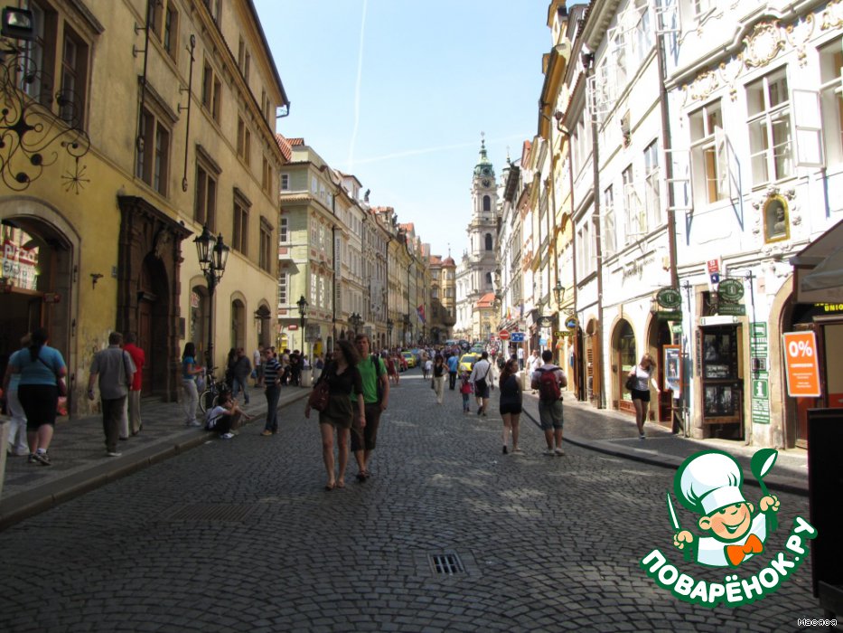 Порции в кафе и ресторанах поражают - одной вполне могут пообедать двое, а то и трое. Кухня разнообразная, но довольно сытная и тяжелая, поэтому из национальных блюд удалось попробовать Смажени сир(жареный сыр), Вепрево колено(рульку), кнедлики (не понравились) капустный суп с колбасками и гуляш. Колено не понравилось, на любителя оно. Стоит отметить, что в любом кафе к каждому блюду подают салат, соус и кнедлики,что уже входит в стоимость. Отдельно подают корзинку хлеба, вы ее потом увидите в счете, но можно заранее отказаться.