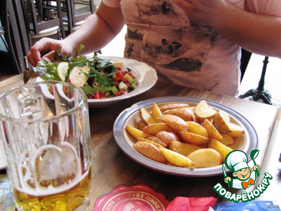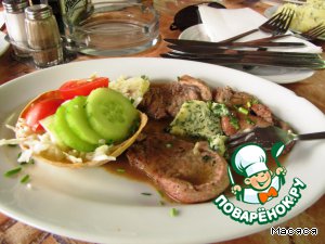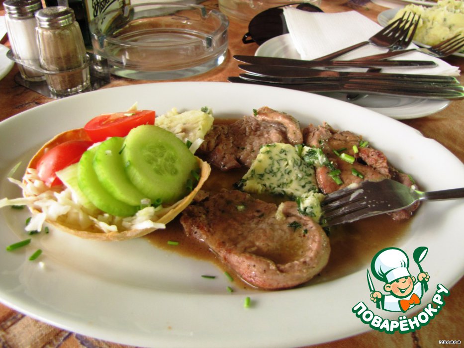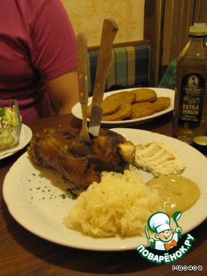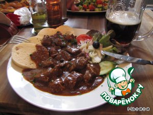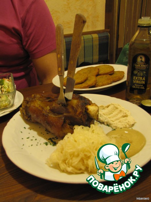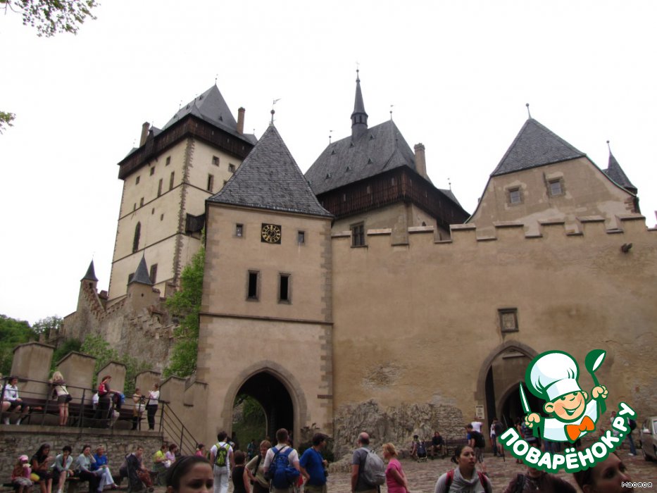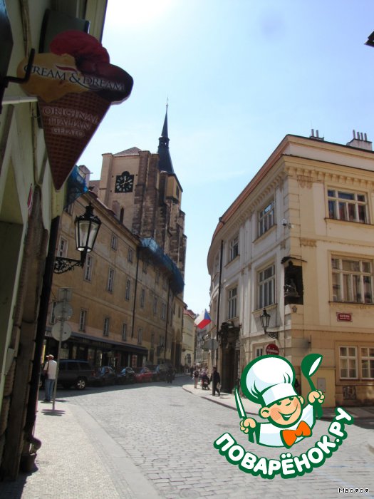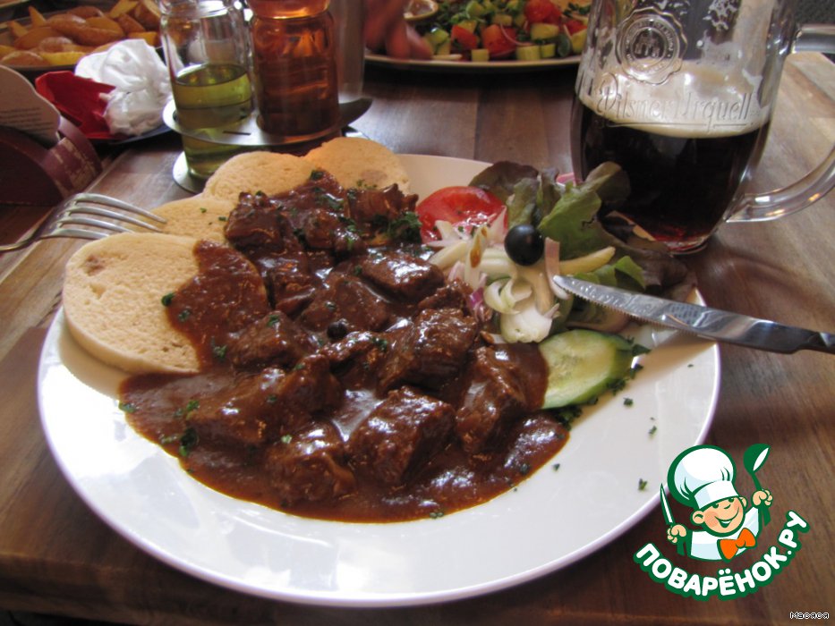 Порции в кафе и ресторанах поражают - одной вполне могут пообедать двое, а то и трое. Кухня разнообразная, но довольно сытная и тяжелая, поэтому из национальных блюд удалось попробовать Смажени сир(жареный сыр), Вепрево колено(рульку), кнедлики (не понравились) капустный суп с колбасками и гуляш. Колено не понравилось, на любителя оно. Стоит отметить, что в любом кафе к каждому блюду подают салат, соус и кнедлики,что уже входит в стоимость. Отдельно подают корзинку хлеба, вы ее потом увидите в счете, но можно заранее отказаться.