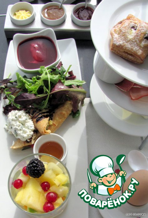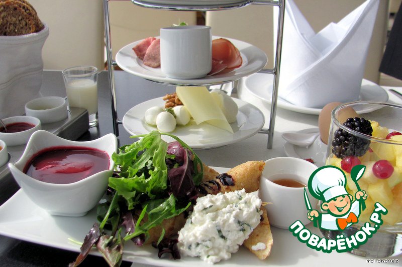 А вот и сам завтрак, точнее два его варианта: блинчики с овощами и зерненым творогом с травами, йогурт под ягодным соусом фруктовый салат или "этажерка" с сыром, колбасами, красной рыбой и моцареллой.