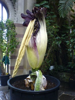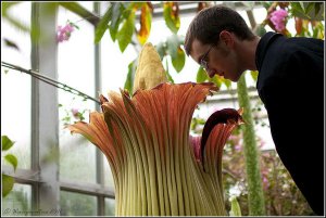 Аморфофаллус титанический, или Титан Арум (лат. Amorphophallus titanum) — цветущее растение с самыми крупными неразветвленными соцветиями в мире. Благодаря своему запаху, похожему на вонь разлагающихся животных, Арум больше известен под названиями «цветок-падаль» или «трупный цветок». [cut]