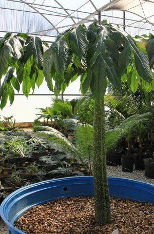 После того, как цветок отмирает, один стебель, который достигает размеров небольшого дерева, продолжает расти из подземной клубнелуковицы. В верхней части стебля содержится множество листков, причем некоторые могут достигать до 6 метров в высоту и 5 метров в поперечнике.