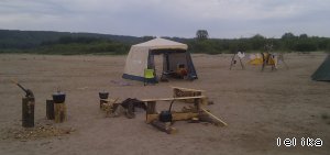 Должна сказать, что установка палатки - это священнодействие, ведь от того, как мы выспимся, зависит настроение на целый день. Поэтому песок под палаткой тщательно выравнивается правилом, кладется подлоджка и только потом ставится палатка со всеми ее причендалами!